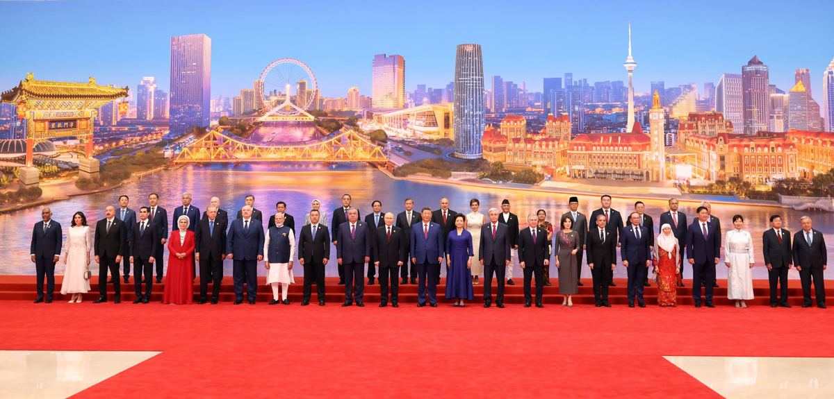 President Xi Jinping and his wife Peng Liyuan pose with international guests for a group photo in Tianjin on Sunday, before a welcoming banquet held for the dignitaries attending the Shanghai Cooperation Organization Summit 2025. FENG YONGBIN /China Daily