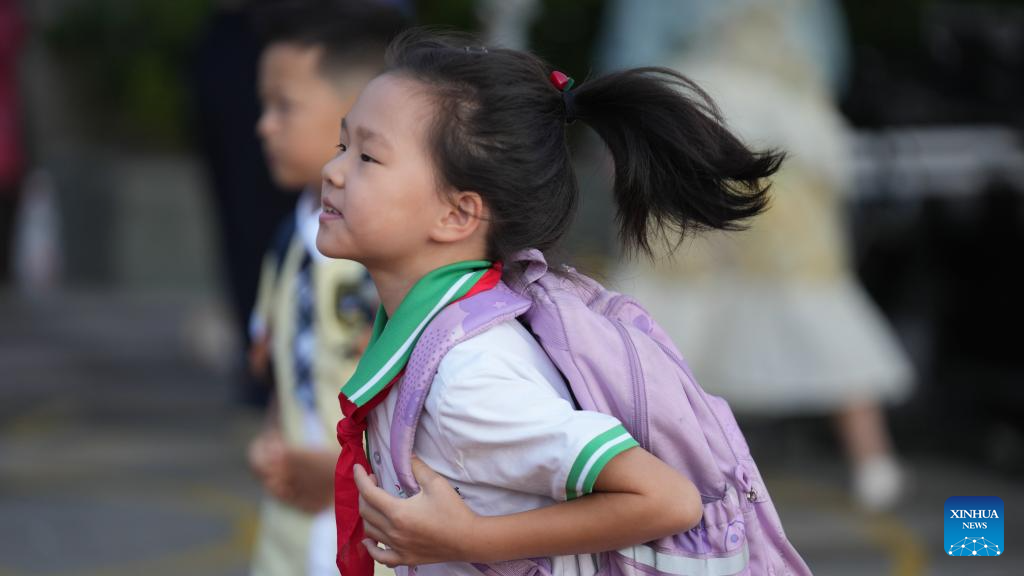 Students arrive at a primary school in Guiyang, southwest China's Guizhou Province, Sept. 1, 2025. The new semester for primary and secondary schools kicked off in many parts of China on Monday. (Xinhua/Tao Liang)