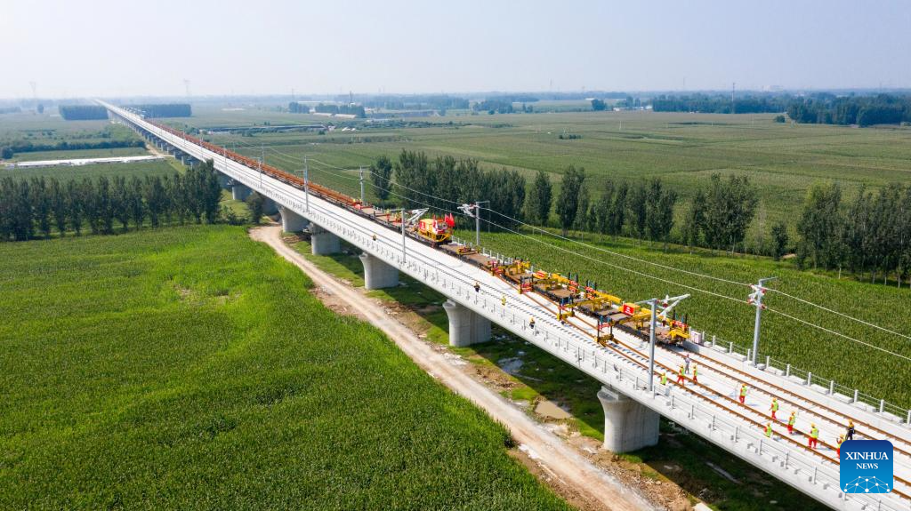 A drone photo taken on Sept. 1, 2025 shows workers operating at the track laying construction site of the Xiong'an-Shangqiu high-speed railway in Hejian city, north China's Hebei Province. Track-laying operation officially kicked off on Monday throughout the Xiong'an-Shangqiu high-speed railway. With a designed speed of 350 km per hour, the 552-kilometer-long railway will connect Xiong'an in north China's Hebei Province and Shangqiu in central China's Henan Province after completion. (Photo by Yuan Ruiyu/Xinhua)
