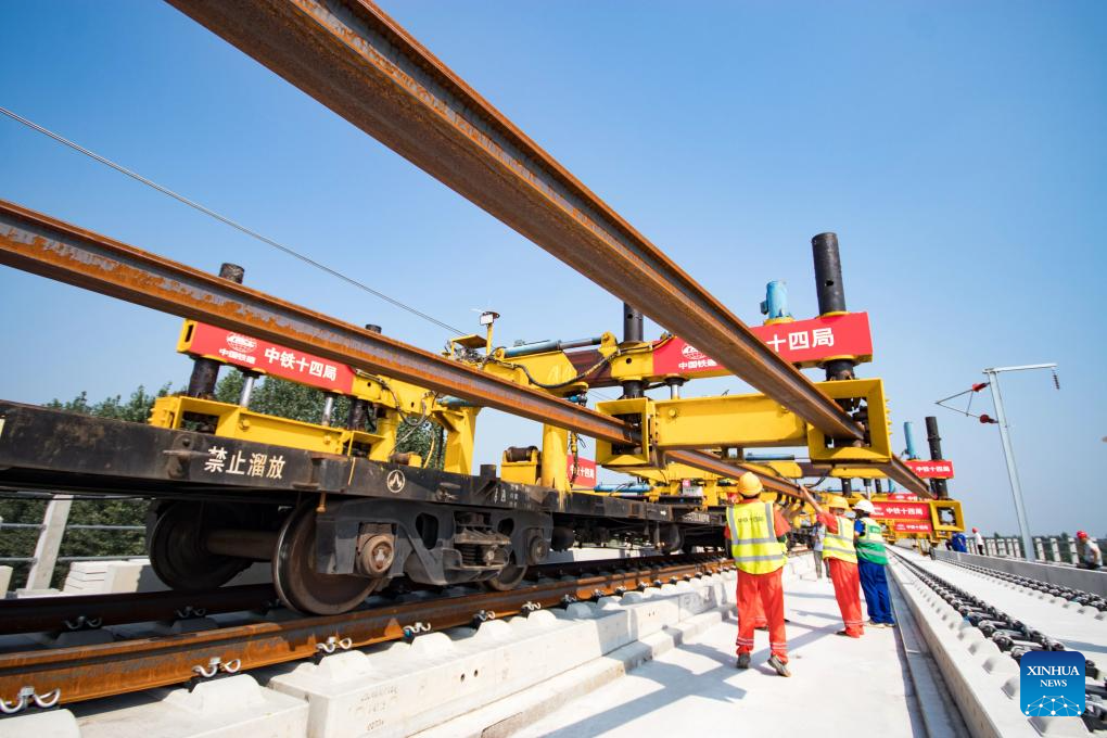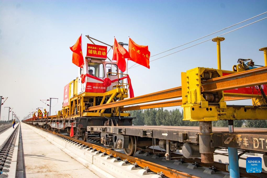Workers operate at the track laying construction site of the Xiong'an-Shangqiu high-speed railway in Hejian city, north China's Hebei Province, Sept. 1, 2025. Track-laying operation officially kicked off on Monday throughout the Xiong'an-Shangqiu high-speed railway. With a designed speed of 350 km per hour, the 552-kilometer-long railway will connect Xiong'an in north China's Hebei Province and Shangqiu in central China's Henan Province after completion. (Photo by Yuan Ruiyu/Xinhua)