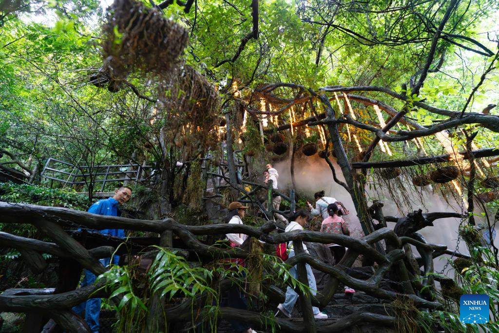 Tourists visit a scenic area themed on dendrobium officinale health tourism in Liulangcheng Village of Guangnan County, Wenshan Zhuang and Miao Autonomous Prefecture, southwest China's Yunnan Province, Aug. 27, 2025. By adopting an integrated industrial model connecting companies, cooperatives, production bases, and farmers, Guangnan County has established a comprehensive development framework centered on dendrobium officinale, a valuable Chinese herbal medicine. The framework spans cultivation, processing, sales, and health tourism, boosting local farmers' income. (Xinhua/Gao Yongwei)