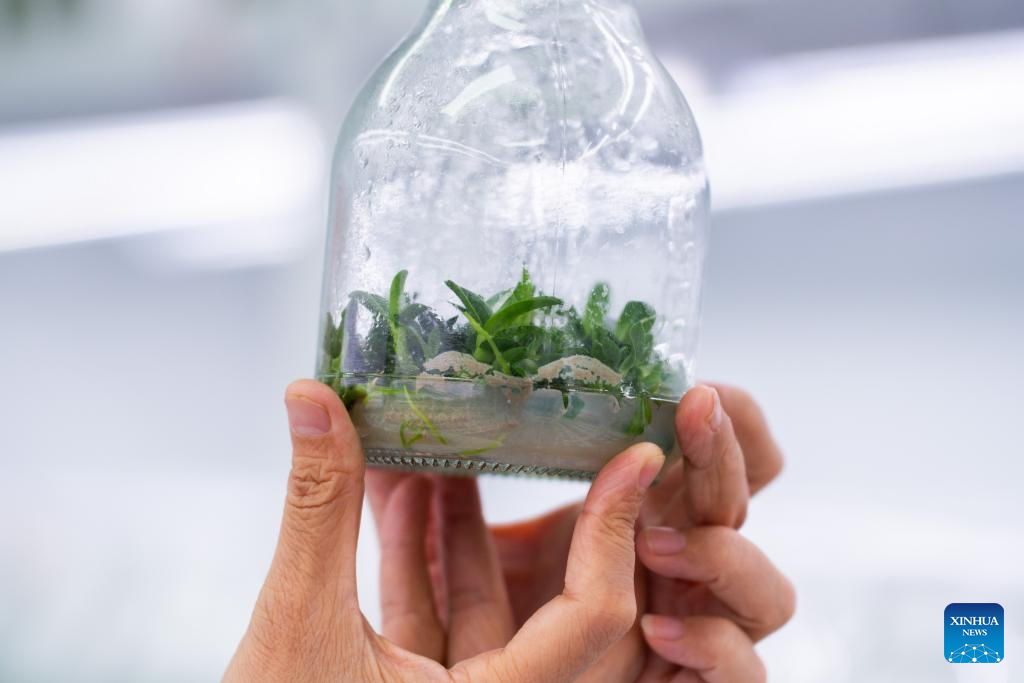 This photo taken on Aug. 27, 2025 shows seedlings of dendrobium officinale at a dendrobium officinale planting base in Guangnan County, Wenshan Zhuang and Miao Autonomous Prefecture, southwest China's Yunnan Province. By adopting an integrated industrial model connecting companies, cooperatives, production bases, and farmers, Guangnan County has established a comprehensive development framework centered on dendrobium officinale, a valuable Chinese herbal medicine. The framework spans cultivation, processing, sales, and health tourism, boosting local farmers' income. (Xinhua/Gao Yongwei)