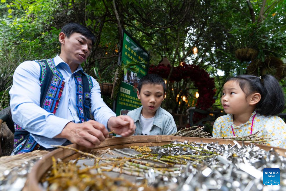 Tourists learn about skills for processing dendrobium officinale in Liulangcheng Village of Guangnan County, Wenshan Zhuang and Miao Autonomous Prefecture, southwest China's Yunnan Province, Aug. 28, 2025. By adopting an integrated industrial model connecting companies, cooperatives, production bases, and farmers, Guangnan County has established a comprehensive development framework centered on dendrobium officinale, a valuable Chinese herbal medicine. The framework spans cultivation, processing, sales, and health tourism, boosting local farmers' income. (Xinhua/Gao Yongwei)