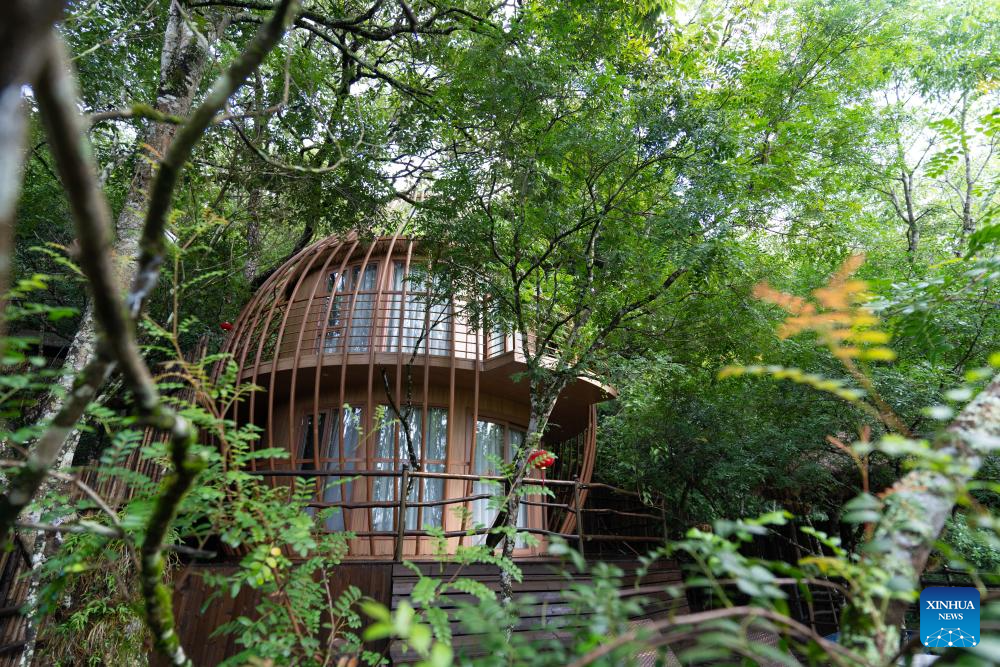 This photo taken on Aug. 27, 2025 shows a homestay inside a scenic area themed on dendrobium officinale health tourism in Liulangcheng Village of Guangnan County, Wenshan Zhuang and Miao Autonomous Prefecture, southwest China's Yunnan Province. By adopting an integrated industrial model connecting companies, cooperatives, production bases, and farmers, Guangnan County has established a comprehensive development framework centered on dendrobium officinale, a valuable Chinese herbal medicine. The framework spans cultivation, processing, sales, and health tourism, boosting local farmers' income. (Xinhua/Gao Yongwei)