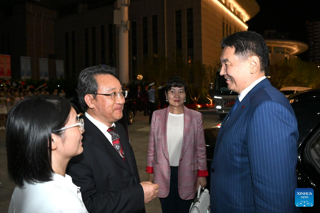 Mongolian President Ukhnaa Khurelsukh, who is here for the Shanghai Cooperation Organization (SCO) Summit 2025, leaves Tianjin for Beijing to attend the commemorations marking the 80th anniversary of the victory in the Chinese People's War of Resistance against Japanese Aggression and the World Anti-Fascist War, on Sept. 1, 2025. (Xinhua/Huang Bohan)