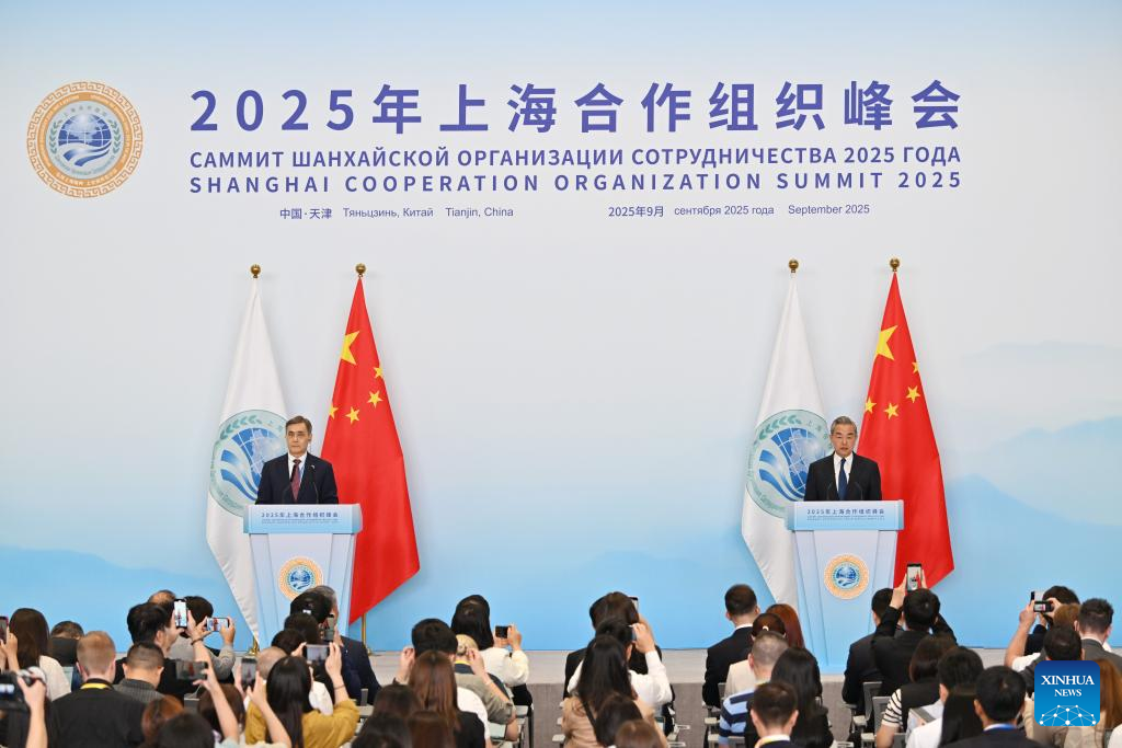 Chinese Foreign Minister Wang Yi, also a member of the Political Bureau of the Communist Party of China Central Committee, and Secretary-General of the Shanghai Cooperation Organization (SCO) Nurlan Yermekbayev meet the press in Tianjin, north China, Sept. 1, 2025. (Xinhua/Li Ran)