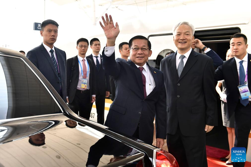 Acting President of Myanmar Min Aung Hlaing leaves Tianjin after attending the Shanghai Cooperation Organization (SCO) Summit 2025, for Beijing to attend the commemorations marking the 80th anniversary of the victory in the Chinese People's War of Resistance against Japanese Aggression and the World Anti-Fascist War, on Sept. 2, 2025. (Xinhua/Guo Xulei)