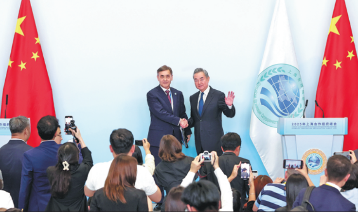 Foreign Minister Wang Yi (right), who is also a member of the Political Bureau of the Communist Party of China Central Committee, shakes hands with Nurlan Yermekbayev (left), secretary-general of the Shanghai Cooperation Organization, at a joint news conference during the SCO Summit 2025 in Tianjin on Monday. ZOU HONG/CHINA DAILY