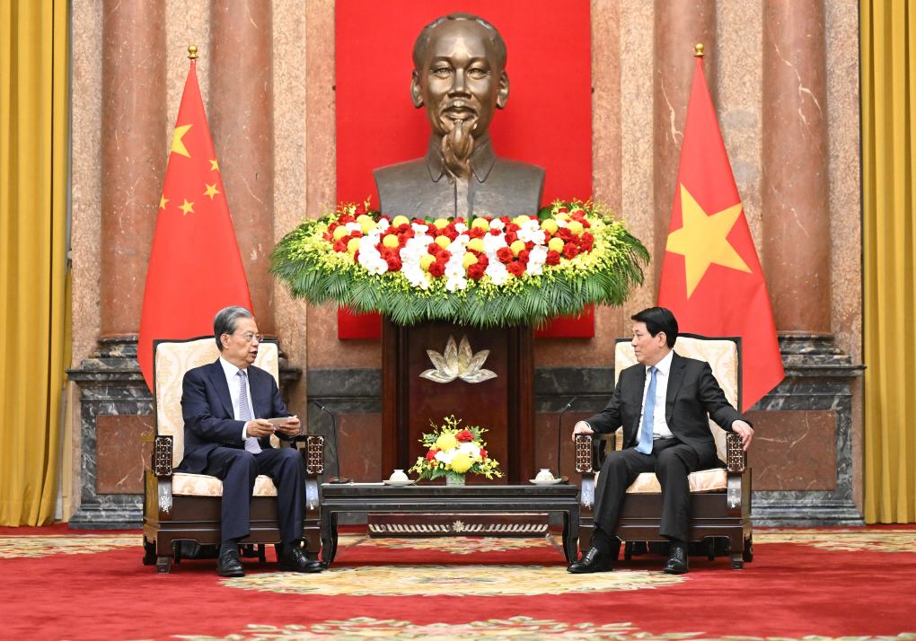 When meeting with Luong Cuong, Zhao conveyed Xi's best wishes to him, noting that China and Vietnam should respond to the external uncertainties with socialist strengths, uphold and strengthen the leadership of the Communist Party, firmly support each other's reform and development endeavors, leverage the exemplary role of China-Vietnam mutually beneficial and win-win cooperation, jointly combat the countercurrents of unilateralism and protectionism, and safeguard international fairness and justice as well as the common interests of developing countries.