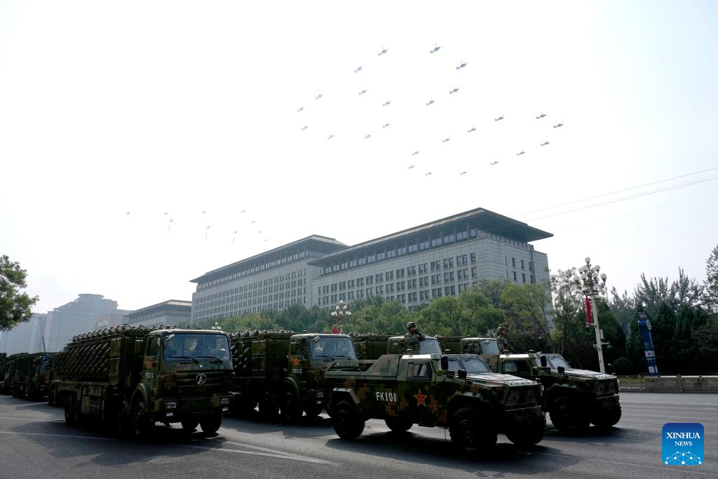 The flag-guarding air echelon flies over the early warning and detection formation during a grand gathering to commemorate the 80th anniversary of the victory in the Chinese People's War of Resistance against Japanese Aggression and the World Anti-Fascist War in Beijing, capital of China, Sept. 3, 2025. (Xinhua/Shao Rui)