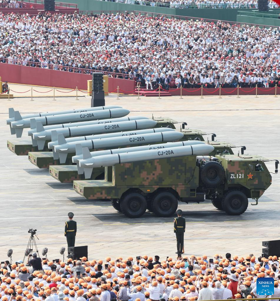 The cruise missile formation attends a military parade in Beijing, capital of China, Sept. 3, 2025. China on Wednesday held a grand gathering to commemorate the 80th anniversary of the victory in the Chinese People's War of Resistance against Japanese Aggression and the World Anti-Fascist War. (Xinhua/Yao Dawei)