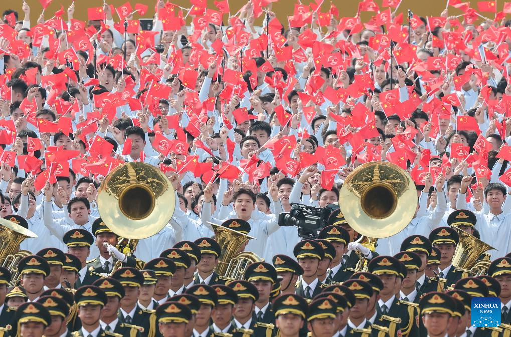 Members of the joint military band of the Chinese People's Liberation Army and a chorus attend a grand gathering to commemorate the 80th anniversary of the victory in the Chinese People's War of Resistance against Japanese Aggression and the World Anti-Fascist War in Beijing, capital of China, Sept. 3, 2025. (Xinhua/Liu Dawei)