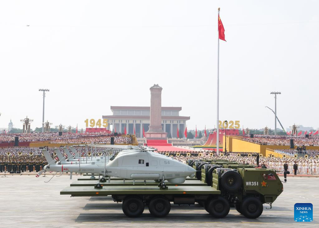 The airborne unmanned warfare formation attends a military parade in Beijing, capital of China, Sept. 3, 2025. China on Wednesday held a grand gathering to commemorate the 80th anniversary of the victory in the Chinese People's War of Resistance against Japanese Aggression and the World Anti-Fascist War. (Xinhua/Liu Dawei)