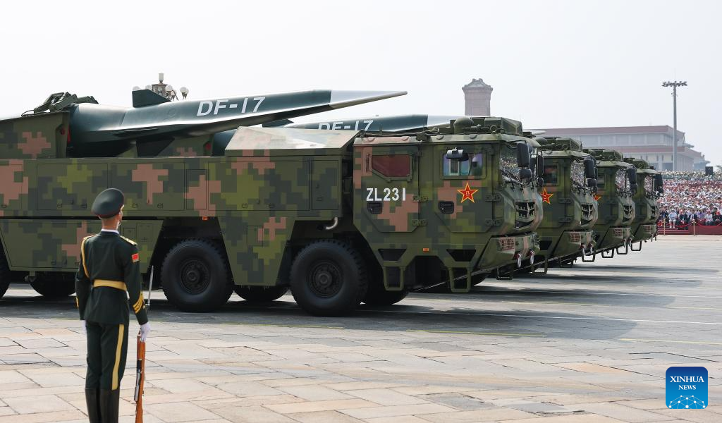 The hypersonic missile formation attends a military parade in Beijing, capital of China, Sept. 3, 2025. China on Wednesday held a grand gathering to commemorate the 80th anniversary of the victory in the Chinese People's War of Resistance against Japanese Aggression and the World Anti-Fascist War. (Xinhua/Xu Yu)