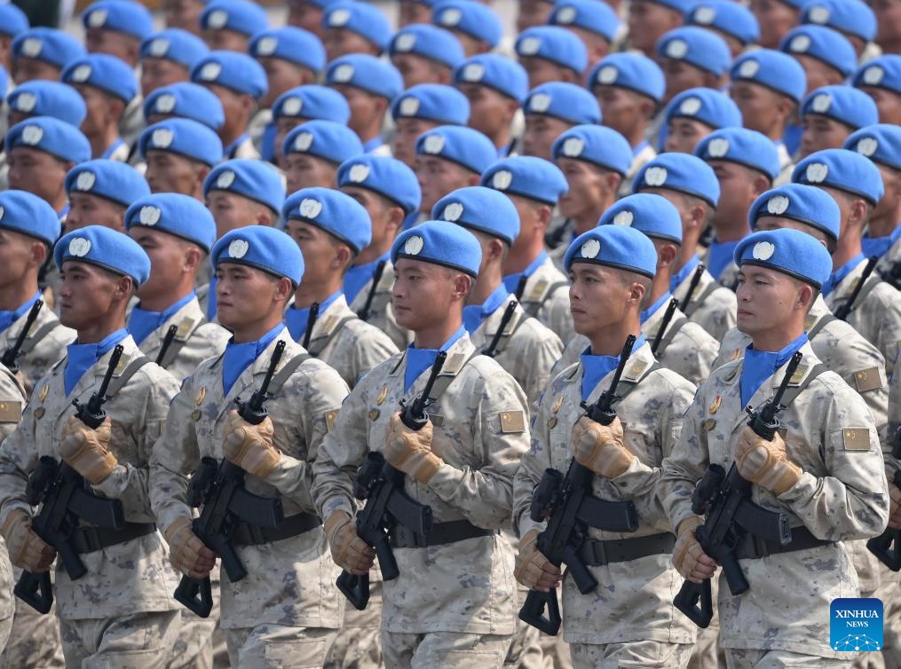 The Chinese UN peacekeepers formation passes through Tian'anmen Square during a military parade in Beijing, capital of China, Sept. 3, 2025. China on Wednesday held a grand gathering to commemorate the 80th anniversary of the victory in the Chinese People's War of Resistance against Japanese Aggression and the World Anti-Fascist War. (Xinhua/Jiang Han)