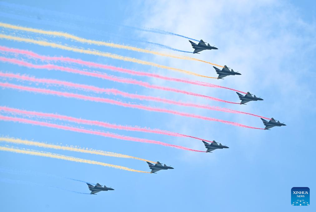 An echelon of trainer aircraft flies over Tian'anmen Square during a military parade in Beijing, capital of China, Sept. 3, 2025. China on Wednesday held a grand gathering to commemorate the 80th anniversary of the victory in the Chinese People's War of Resistance against Japanese Aggression and the World Anti-Fascist War. (Xinhua/Chen Yichen)