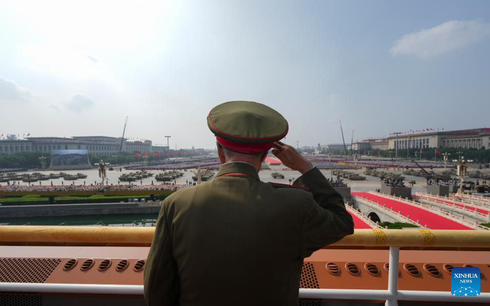 A veteran salutes during a military parade in Beijing, capital of China, Sept. 3, 2025. China on Wednesday held a grand gathering to commemorate the 80th anniversary of the victory in the Chinese People's War of Resistance against Japanese Aggression and the World Anti-Fascist War. (Xinhua/Cai Yang)