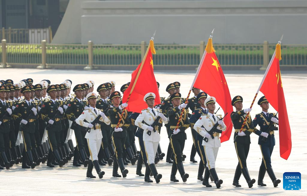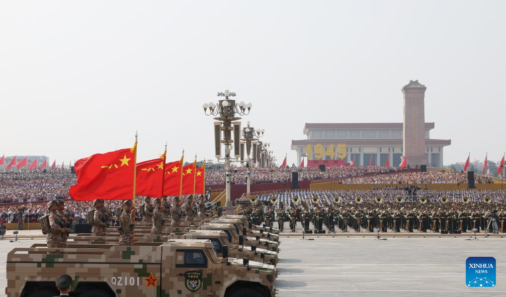 Hero units' banner formation marches through Tian'anmen Square during a military parade in Beijing, capital of China, Sept. 3, 2025. China on Wednesday held a grand gathering to commemorate the 80th anniversary of the victory in the Chinese People's War of Resistance against Japanese Aggression and the World Anti-Fascist War. (Xinhua/Yang Lei)