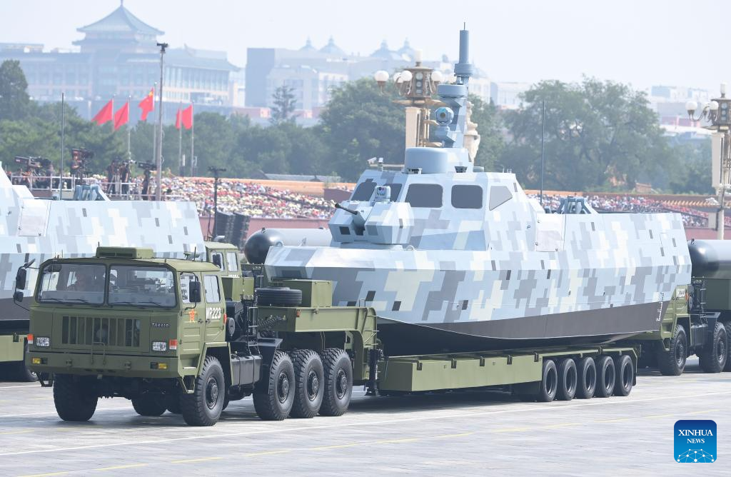 The sea-based unmanned warfare formation passes through Tian'anmen Square during a military parade in Beijing, capital of China, Sept. 3, 2025. China on Wednesday held a grand gathering to commemorate the 80th anniversary of the victory in the Chinese People's War of Resistance against Japanese Aggression and the World Anti-Fascist War. (Xinhua/Jiang Han)