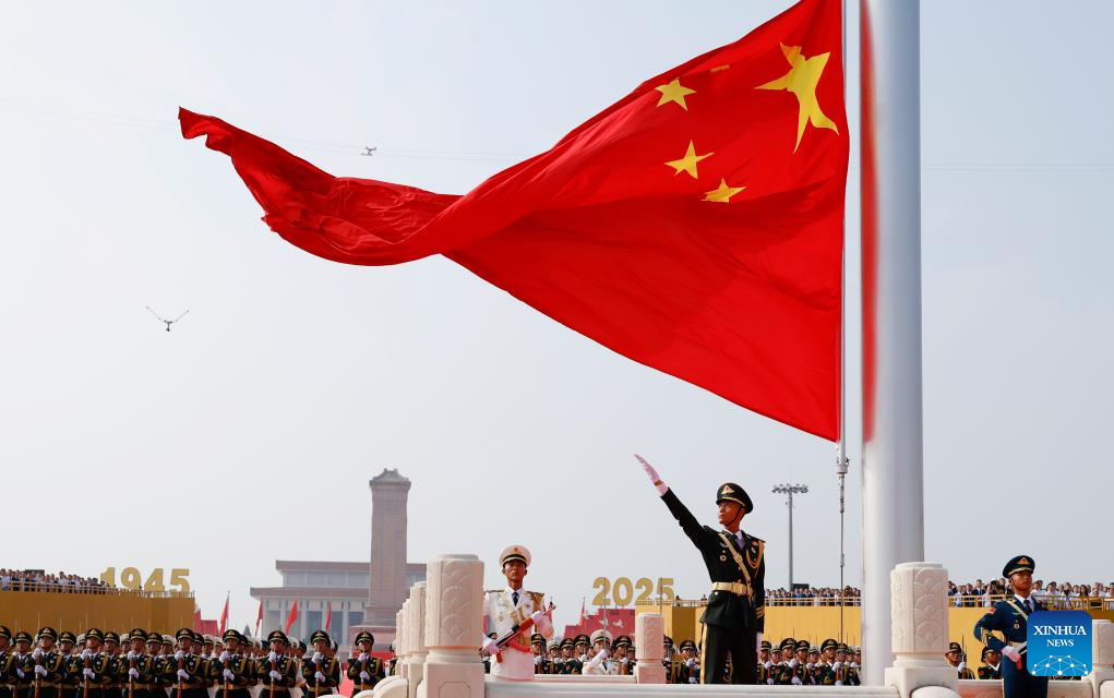 A national flag-raising ceremony is held at Tian'anmen Square during a grand gathering to commemorate the 80th anniversary of the victory in the Chinese People's War of Resistance against Japanese Aggression and the World Anti-Fascist War in Beijing, capital of China, Sept. 3, 2025. (Xinhua/Fei Maohua)
