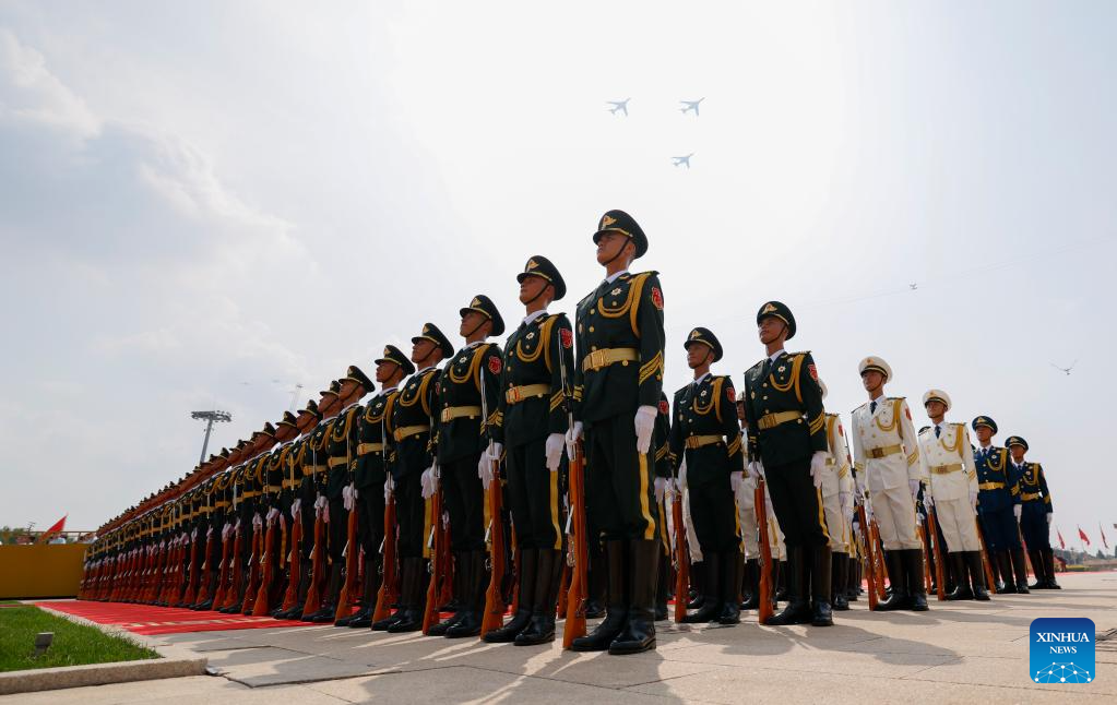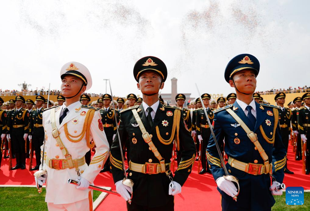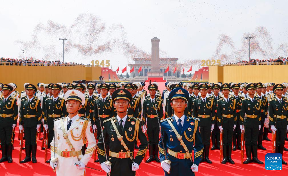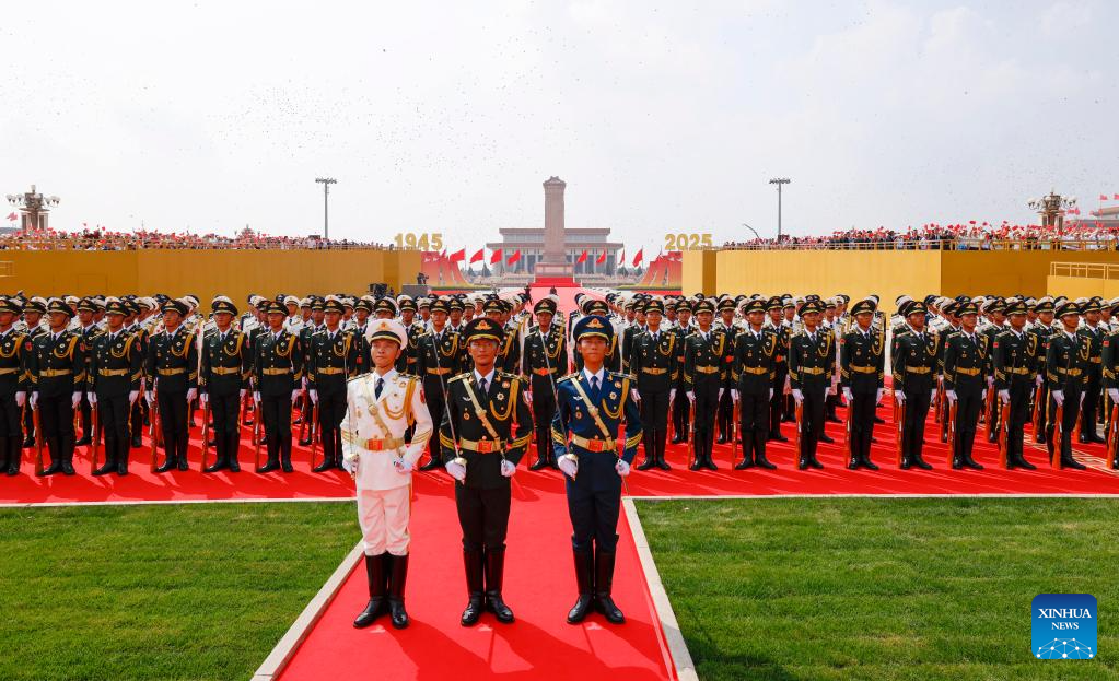 Honor guards stand in formation at Tian'anmen Square in Beijing, capital of China, Sept. 3, 2025. China on Wednesday held a grand gathering to commemorate the 80th anniversary of the victory in the Chinese People's War of Resistance against Japanese Aggression and the World Anti-Fascist War. (Xinhua/Fei Maohua)