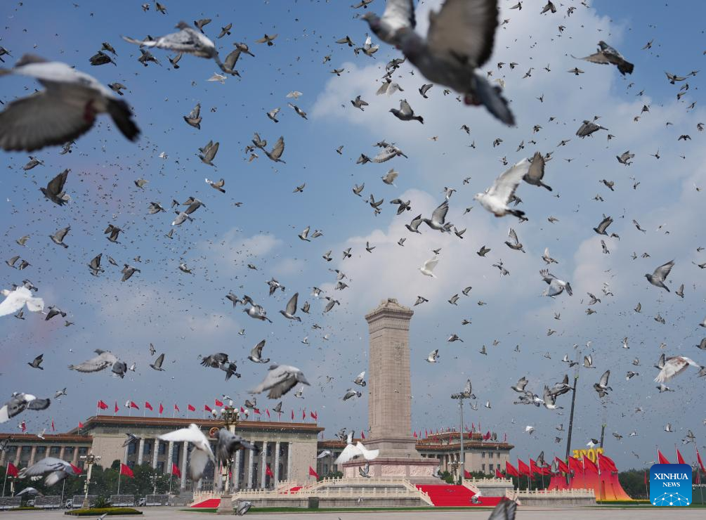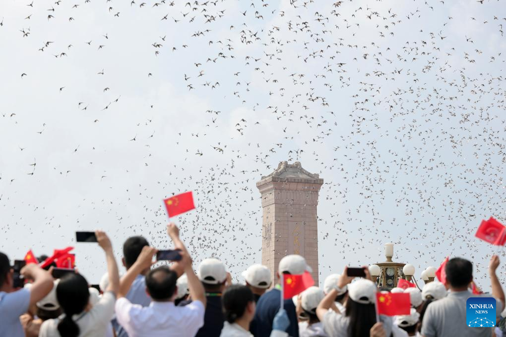 Pigeons are released into the sky over Tian'anmen Square in Beijing, capital of China, Sept. 3, 2025. China on Wednesday held a grand gathering to commemorate the 80th anniversary of the victory in the Chinese People's War of Resistance against Japanese Aggression and the World Anti-Fascist War. (Xinhua/Mu Yu)