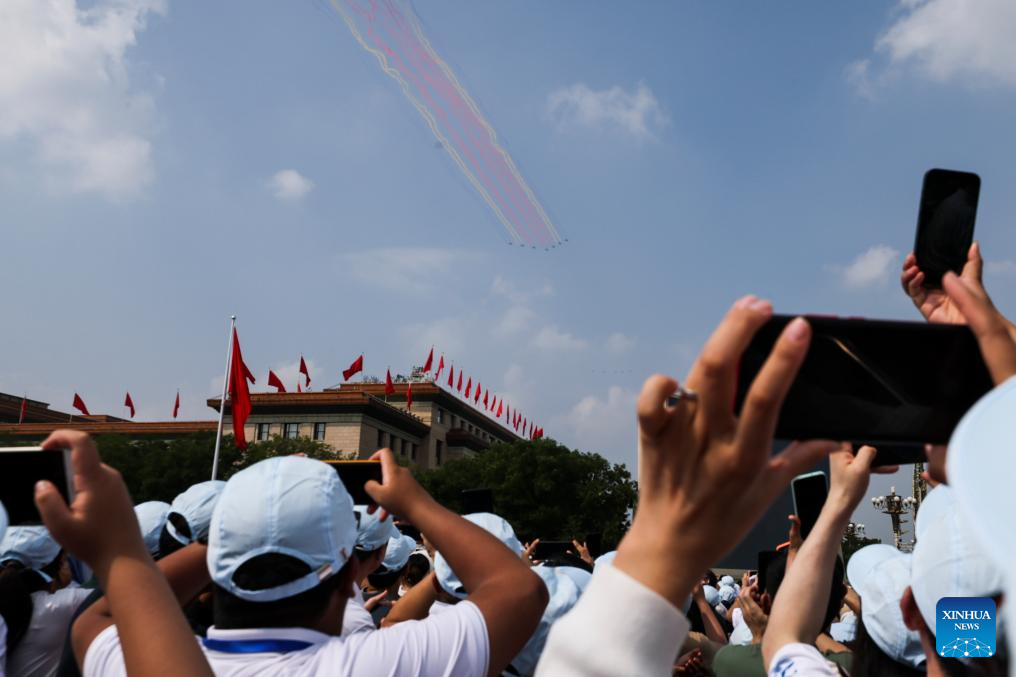 Spectators take photos as the trainer aircraft echelon attends a military parade in Beijing, capital of China, Sept. 3, 2025. China on Wednesday held a grand gathering to commemorate the 80th anniversary of the victory in the Chinese People's War of Resistance against Japanese Aggression and the World Anti-Fascist War. (Xinhua/Ou Dongqu)