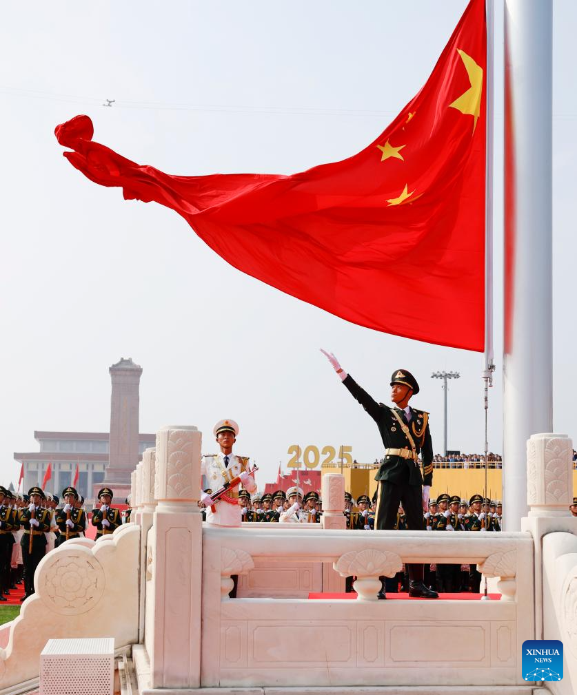 A national flag-raising ceremony is held at Tian'anmen Square during a grand gathering to commemorate the 80th anniversary of the victory in the Chinese People's War of Resistance against Japanese Aggression and the World Anti-Fascist War in Beijing, capital of China, Sept. 3, 2025. (Xinhua/Fei Maohua)