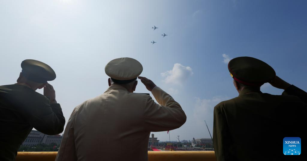Guests salute as a bomber echelon flies over Tian'anmen Square during a grand gathering to commemorate the 80th anniversary of the victory in the Chinese People's War of Resistance against Japanese Aggression and the World Anti-Fascist War in Beijing, capital of China, Sept. 3, 2025. (Xinhua/Cai Yang)