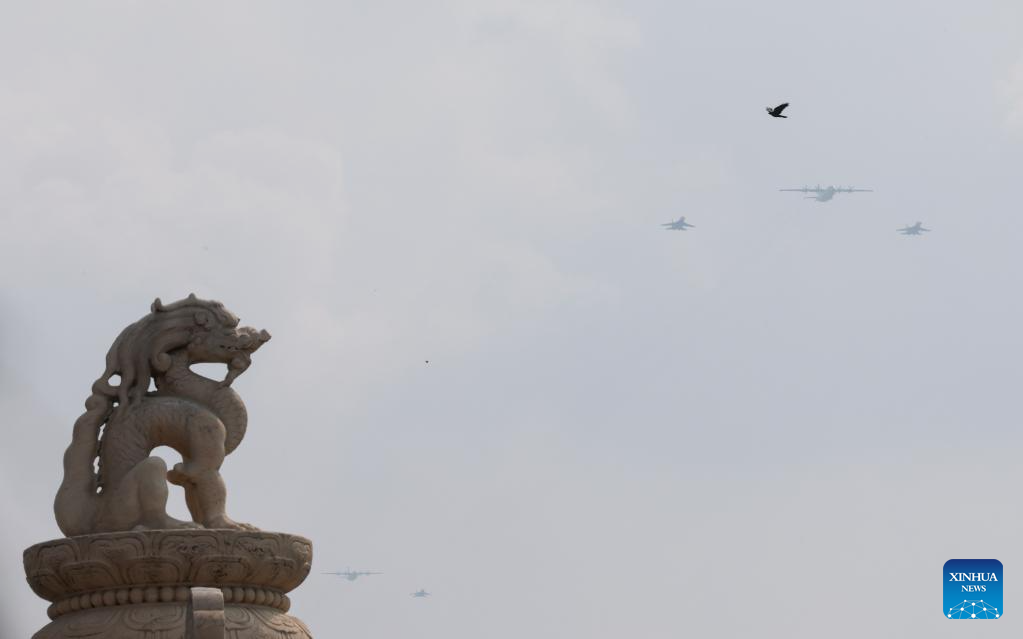 The echelon of special-purpose aircraft attends a military parade during a grand gathering to commemorate the 80th anniversary of the victory in the Chinese People's War of Resistance against Japanese Aggression and the World Anti-Fascist War in Beijing, capital of China, Sept. 3, 2025. (Xinhua/Liu Dawei)