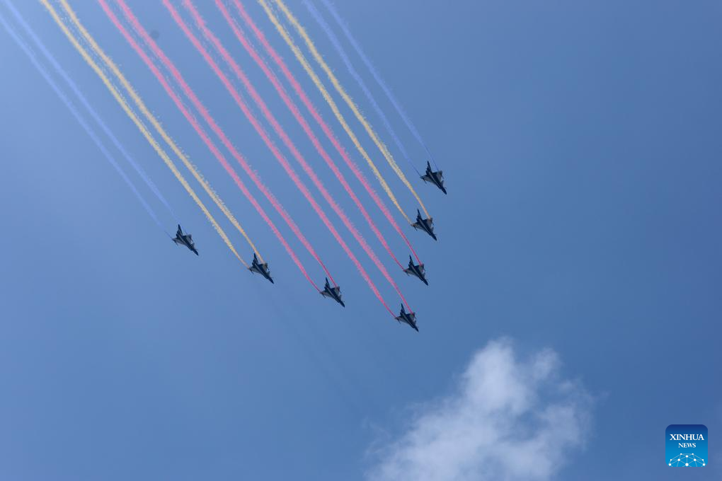 The echelon of trainer aircraft attends a military parade in Beijing, capital of China, Sept. 3, 2025. China on Wednesday held a grand gathering to commemorate the 80th anniversary of the victory in the Chinese People's War of Resistance against Japanese Aggression and the World Anti-Fascist War. (Xinhua/Tang Rufeng)