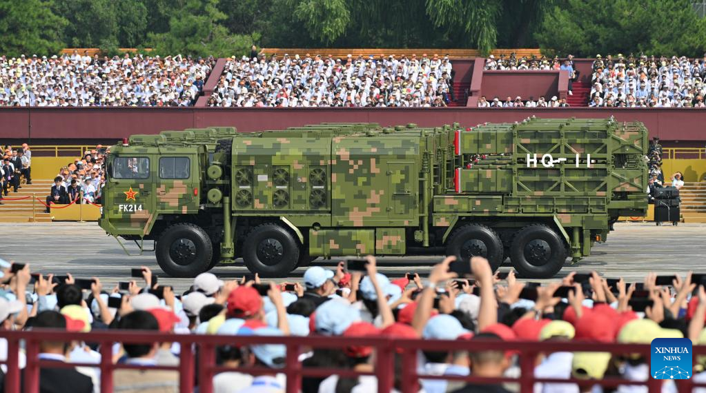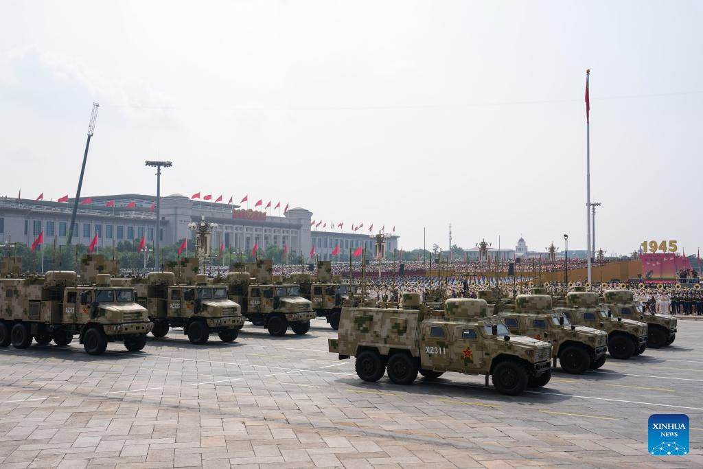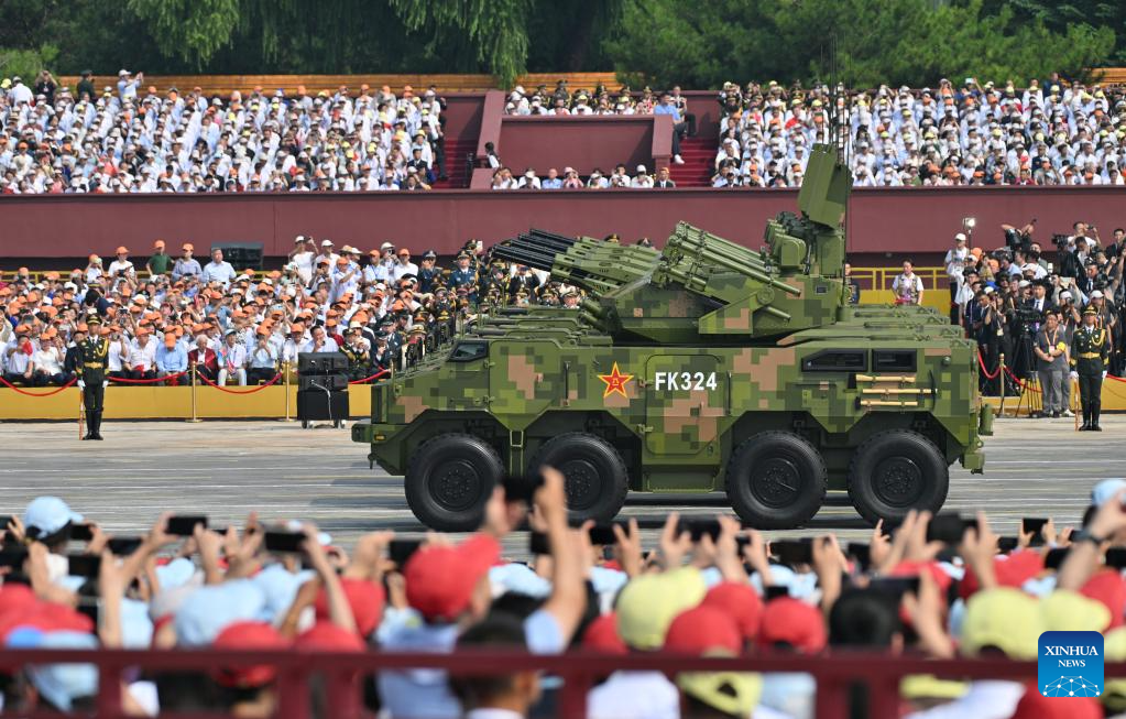 The air defense weaponry formation passes through Tian'anmen Square during a military parade in Beijing, capital of China, Sept. 3, 2025. China on Wednesday held a grand gathering to commemorate the 80th anniversary of the victory in the Chinese People's War of Resistance against Japanese Aggression and the World Anti-Fascist War. (Xinhua/Sun Ruibo)