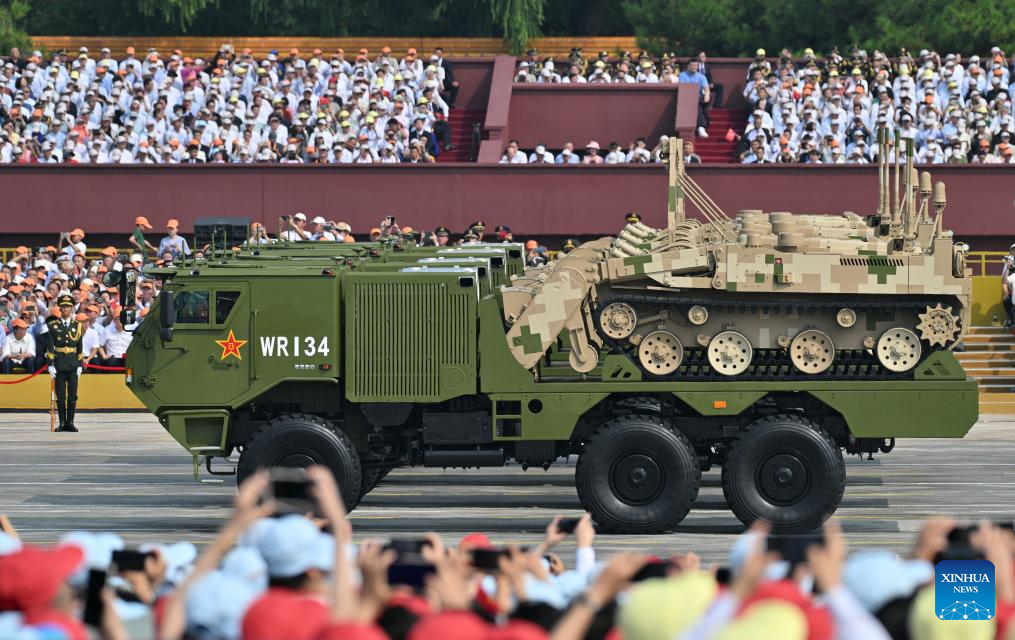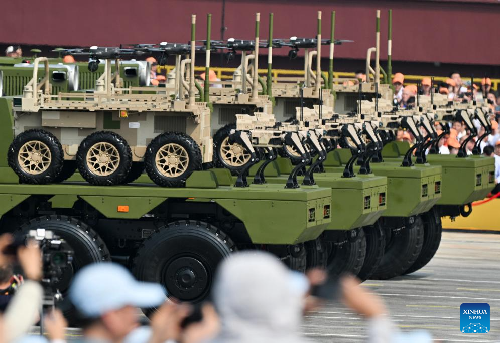 The land-based unmanned combat formation passes through Tian'anmen Square during a military parade in Beijing, capital of China, Sept. 3, 2025. China on Wednesday held a grand gathering to commemorate the 80th anniversary of the victory in the Chinese People's War of Resistance against Japanese Aggression and the World Anti-Fascist War. (Xinhua/Sun Ruibo)