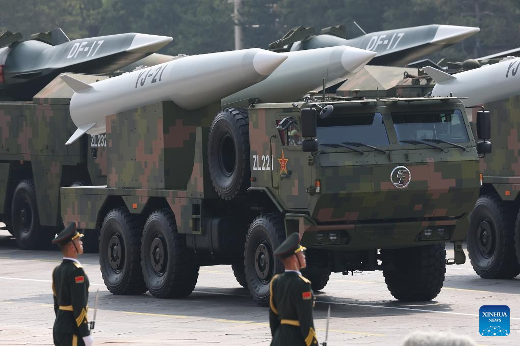 The hypersonic missile formation attends a military parade in Beijing, capital of China, Sept. 3, 2025. China on Wednesday held a grand gathering to commemorate the 80th anniversary of the victory in the Chinese People's War of Resistance against Japanese Aggression and the World Anti-Fascist War. (Xinhua/Pan Yulong)