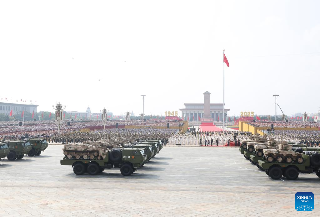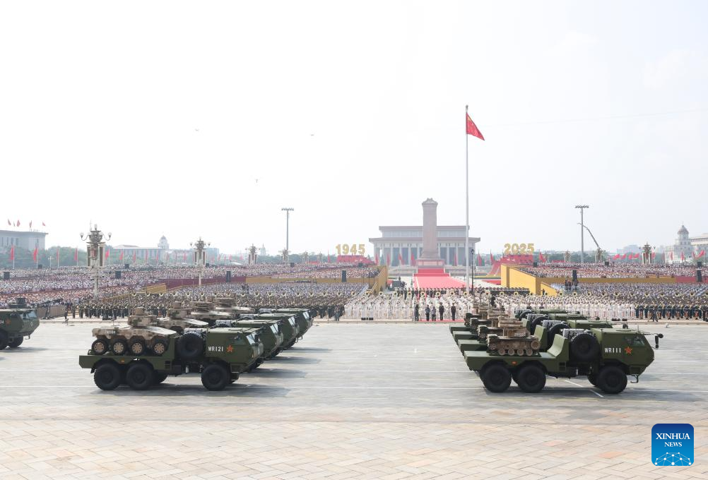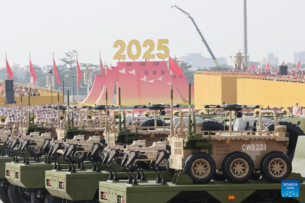 The land-based unmanned warfare formation attends a military parade in Beijing, capital of China, Sept. 3, 2025. China on Wednesday held a grand gathering to commemorate the 80th anniversary of the victory in the Chinese People's War of Resistance against Japanese Aggression and the World Anti-Fascist War. (Xinhua/Chen Bin)
