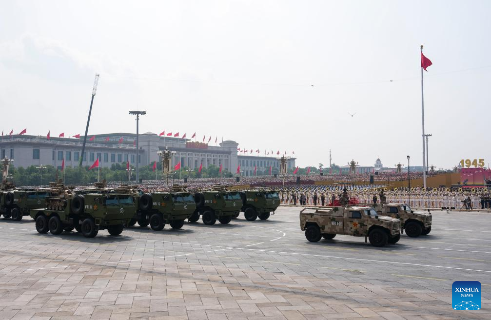 The logistics support formation attends a military parade in Beijing, capital of China, Sept. 3, 2025. China on Wednesday held a grand gathering to commemorate the 80th anniversary of the victory in the Chinese People's War of Resistance against Japanese Aggression and the World Anti-Fascist War. (Xinhua/Li Ga)