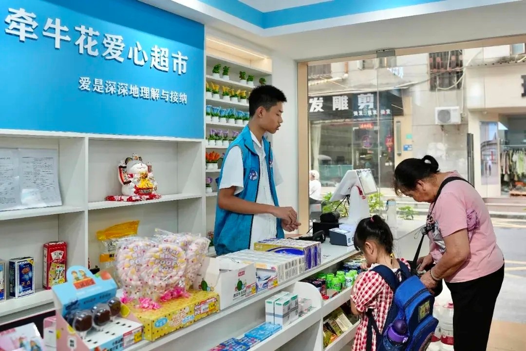 Inside the brightly lit, well-organized store, Xiaoxuan (pseudonym), a young man with autism, works behind the cash register, greeting shoppers with a warm "Welcome."