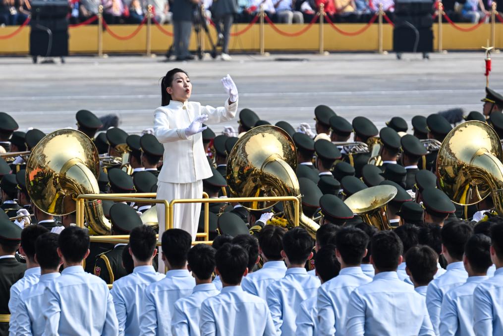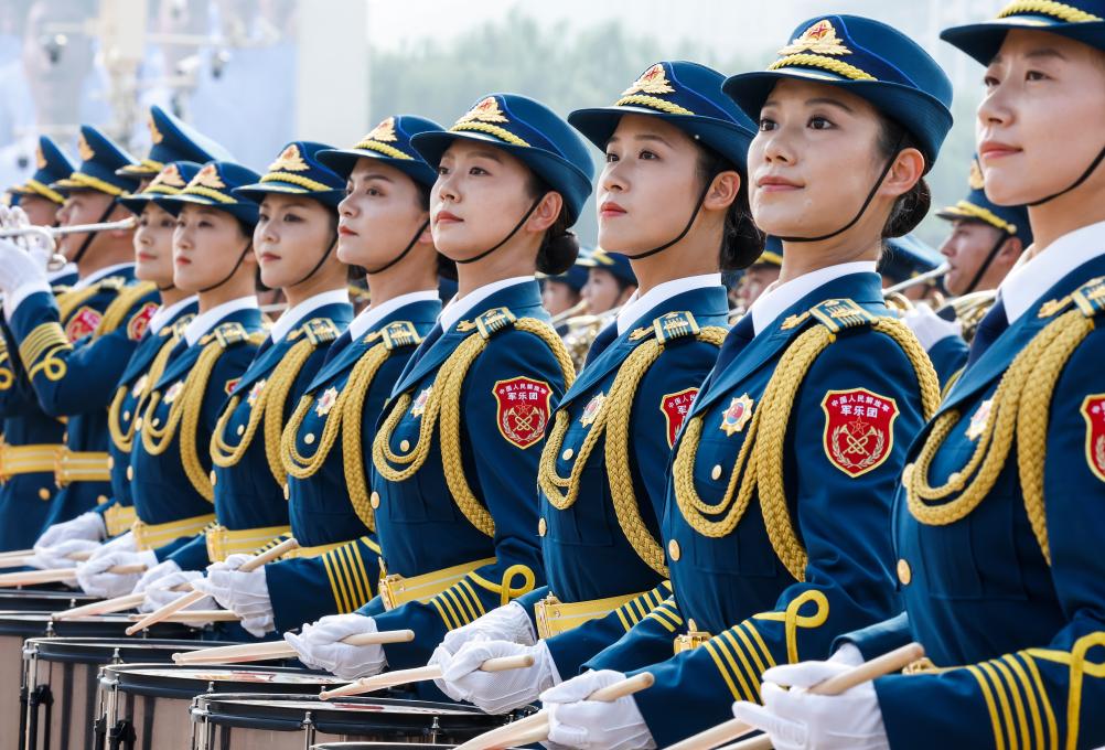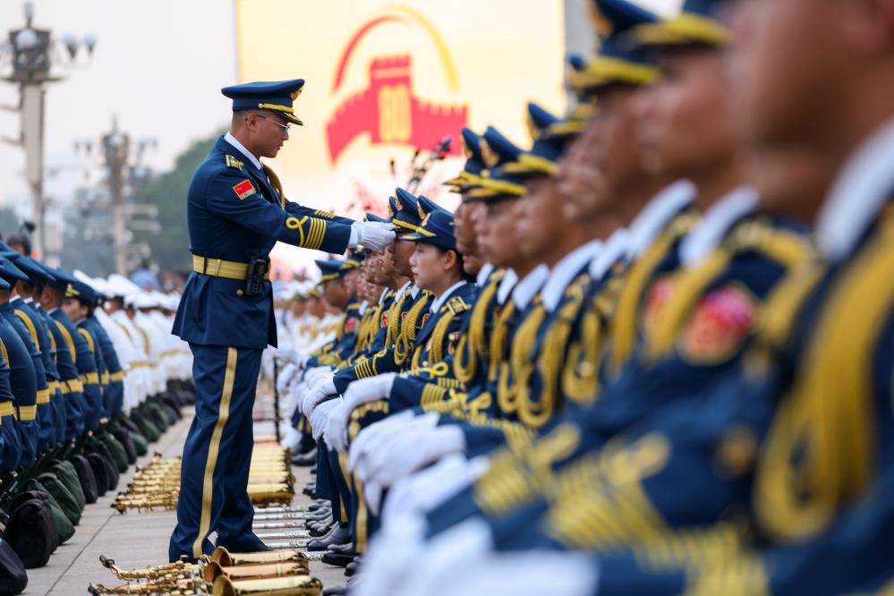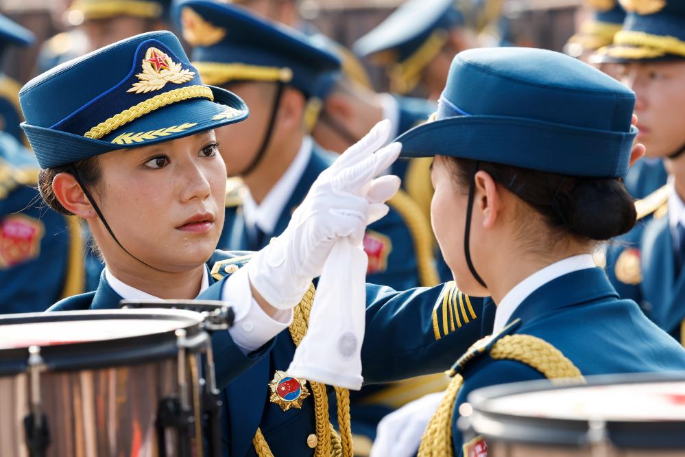 Members of the joint military band of the Chinese People's Liberation Army make preparations ahead of a grand gathering to commemorate the 80th anniversary of the victory in the Chinese People's War of Resistance against Japanese Aggression and the World Anti-Fascist War in Beijing, capital of China, Sept. 3, 2025. (Xinhua/Zhang Yuwei)