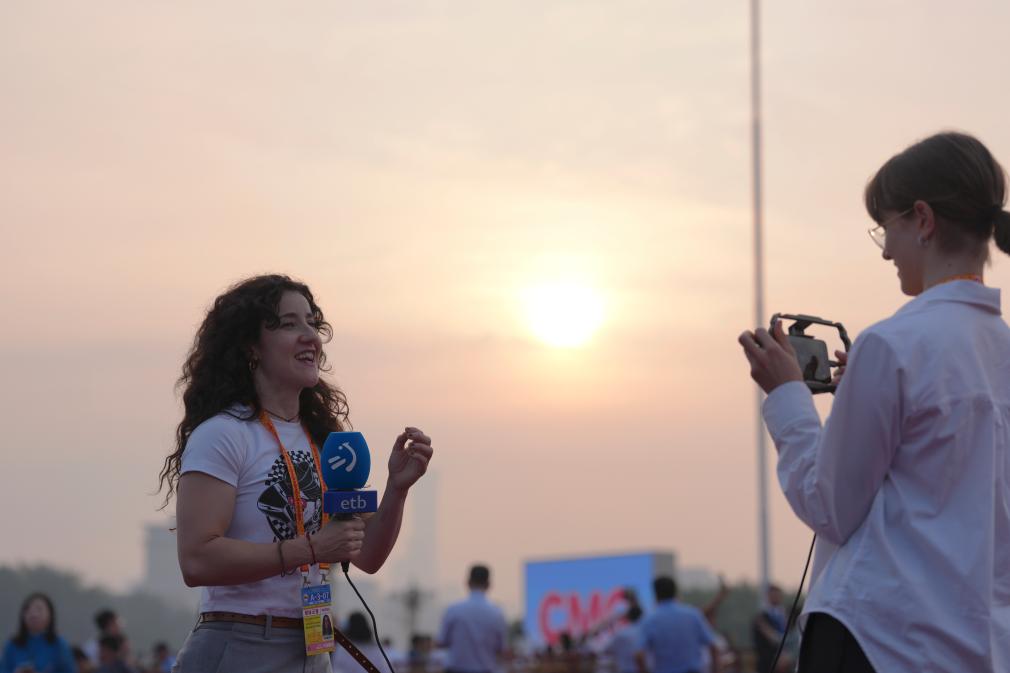 A foreign reporter works ahead of a grand gathering to commemorate the 80th anniversary of the victory in the Chinese People's War of Resistance against Japanese Aggression and the World Anti-Fascist War in Beijing, capital of China, Sept. 3, 2025. (Xinhua/Hu Chao)