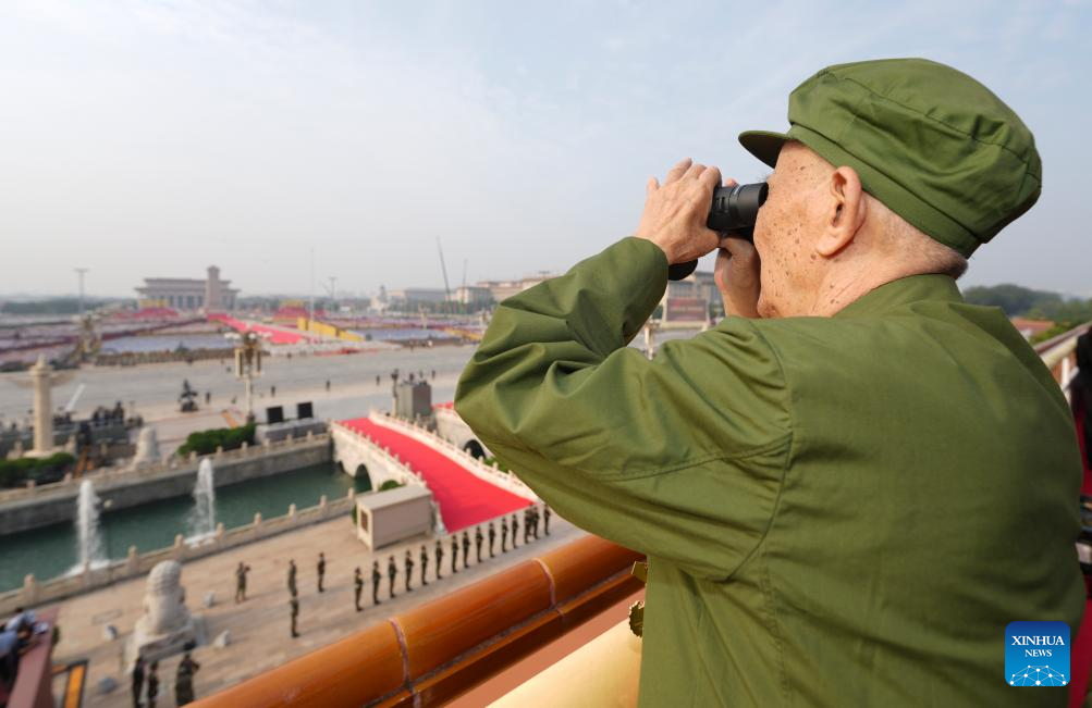 A veteran ascends Tian'anmen Rostrum ahead of a military parade in Beijing, capital of China, Sept. 3, 2025. China on Wednesday held a grand gathering to commemorate the 80th anniversary of the victory in the Chinese People's War of Resistance against Japanese Aggression and the World Anti-Fascist War. (Xinhua/Cai Yang)