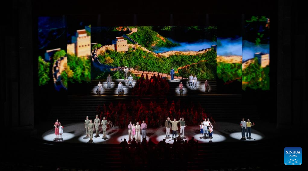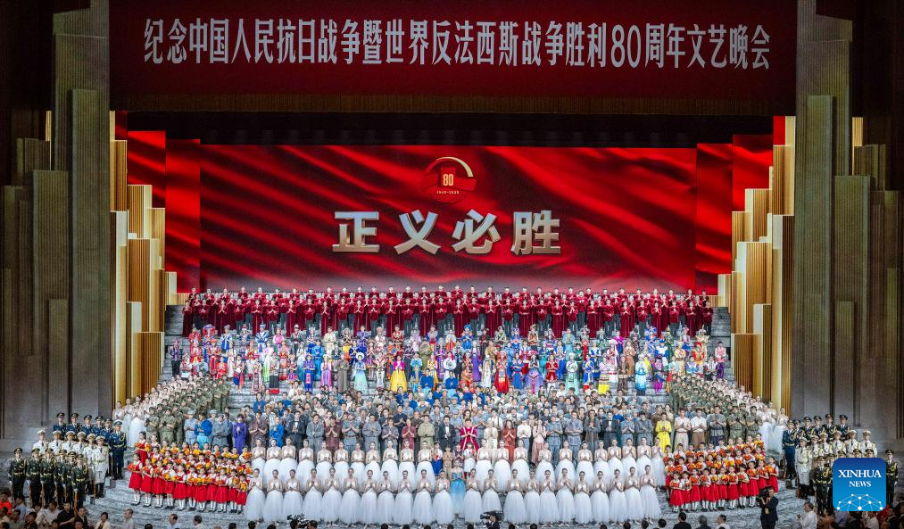 A grand cultural gala with the theme of "Justice Prevails" is staged to commemorate the 80th anniversary of the victory of the Chinese People's War of Resistance against Japanese Aggression and the World Anti-Fascist War at the Great Hall of the People in Beijing, capital of China, Sept. 3, 2025. (Xinhua/Zhai Jianlan)