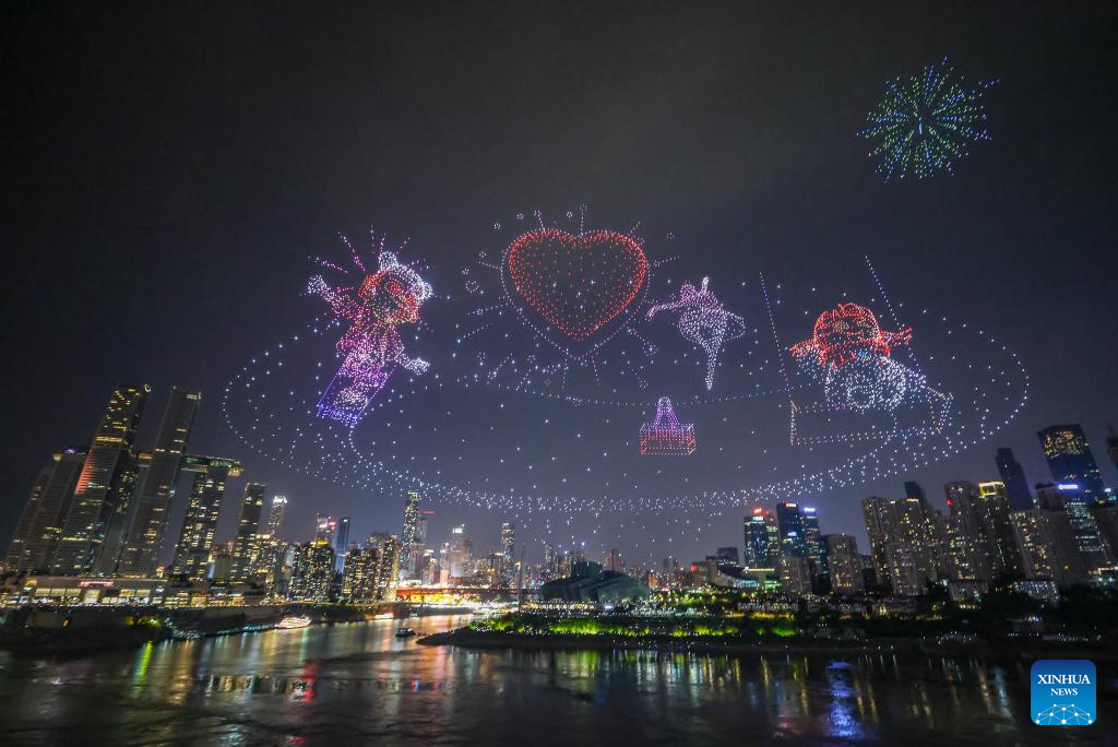 A drone light show is staged in southwest China's Chongqing Municipality, June 17, 2025. (Xinhua/Huang Wei)