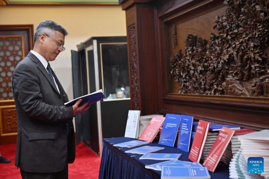 A guest reads a copy of the think tank report "Remembering History and Defending Justice -- Great Contributions of the Main Battlefield in the East of the World Anti-Fascist War" in Beijing, capital of China, Sept. 5, 2025. (Xinhua/Jin Liangkuai)