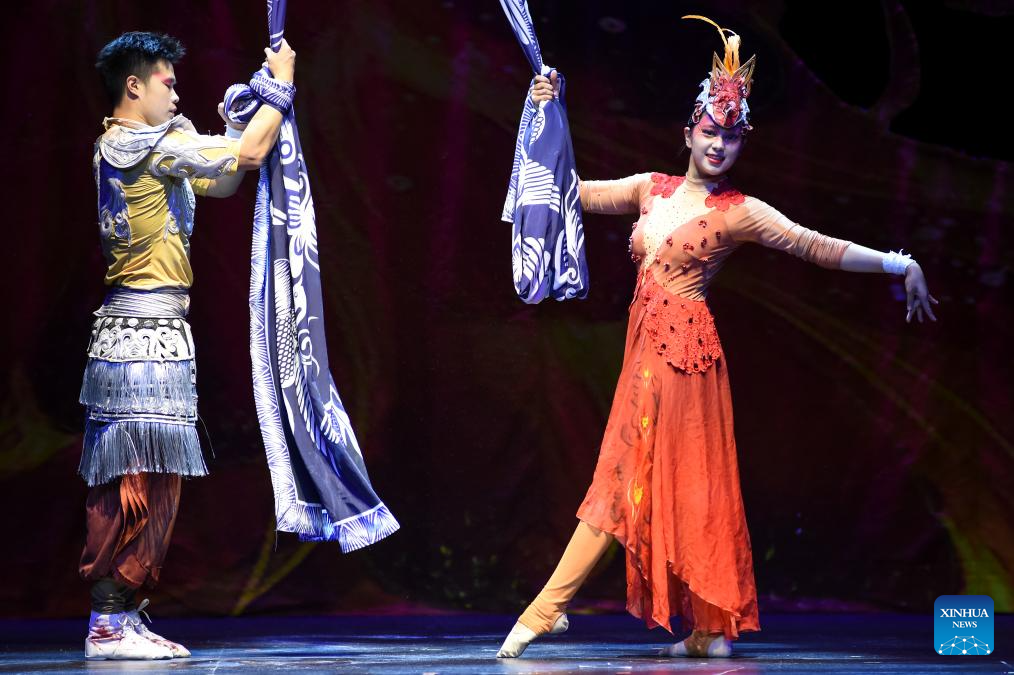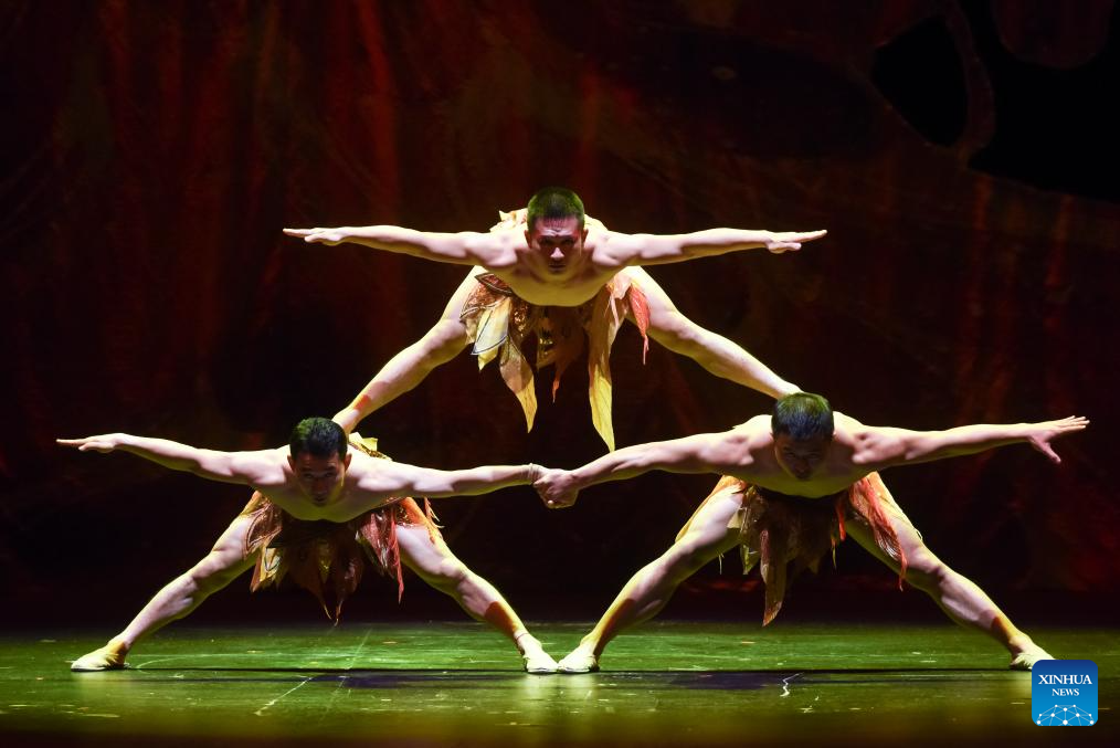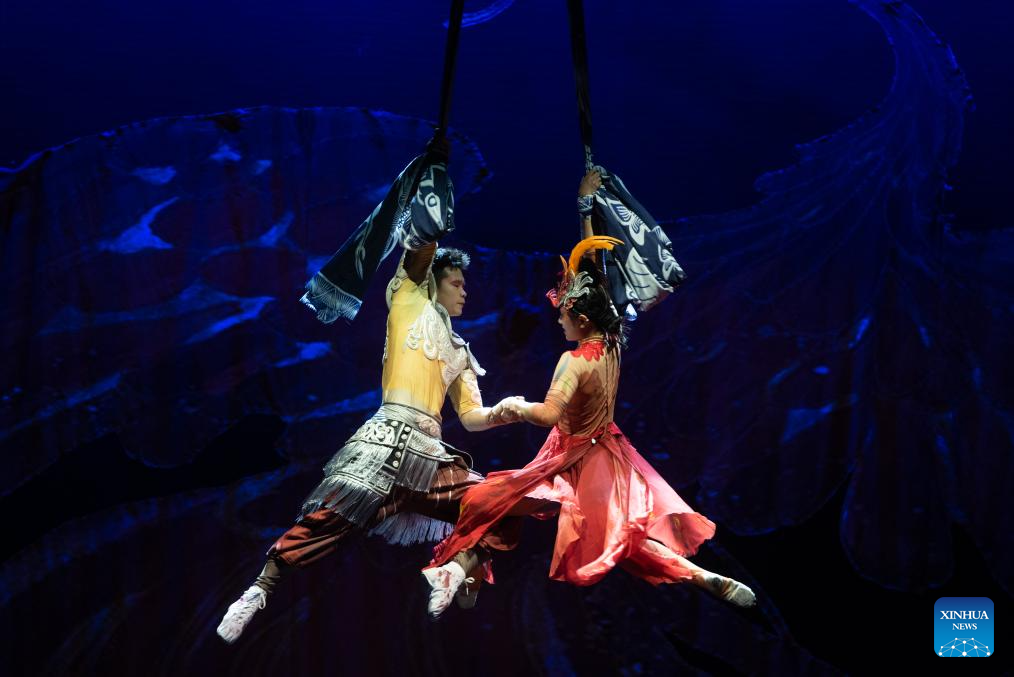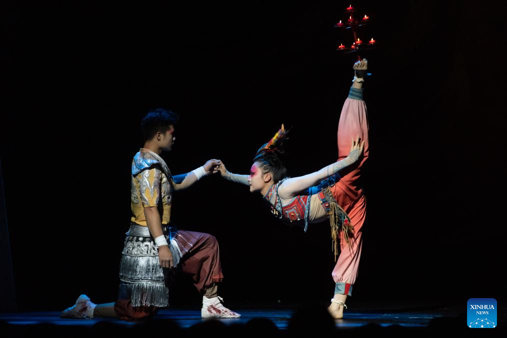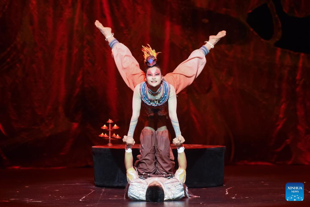 Artists perform during a Chinese acrobatic drama in Madrid, Spain, on Sept. 3, 2025. "Dream Journey: Mysterious Xiangxi," an acrobatic drama created by China's Hunan Acrobatic Art Theater, recently embarked on a tour in Madrid, Barcelona, and other cities in Spain. (Photo by Gustavo Valiente/Xinhua)