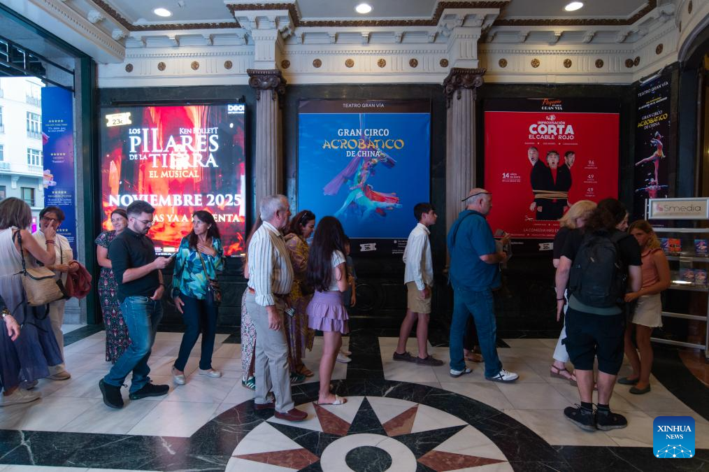 Audience wait to watch a Chinese acrobatic drama in Madrid, Spain, on Sept. 3, 2025. "Dream Journey: Mysterious Xiangxi," an acrobatic drama created by China's Hunan Acrobatic Art Theater, recently embarked on a tour in Madrid, Barcelona, and other cities in Spain. (Photo by Gustavo Valiente/Xinhua)