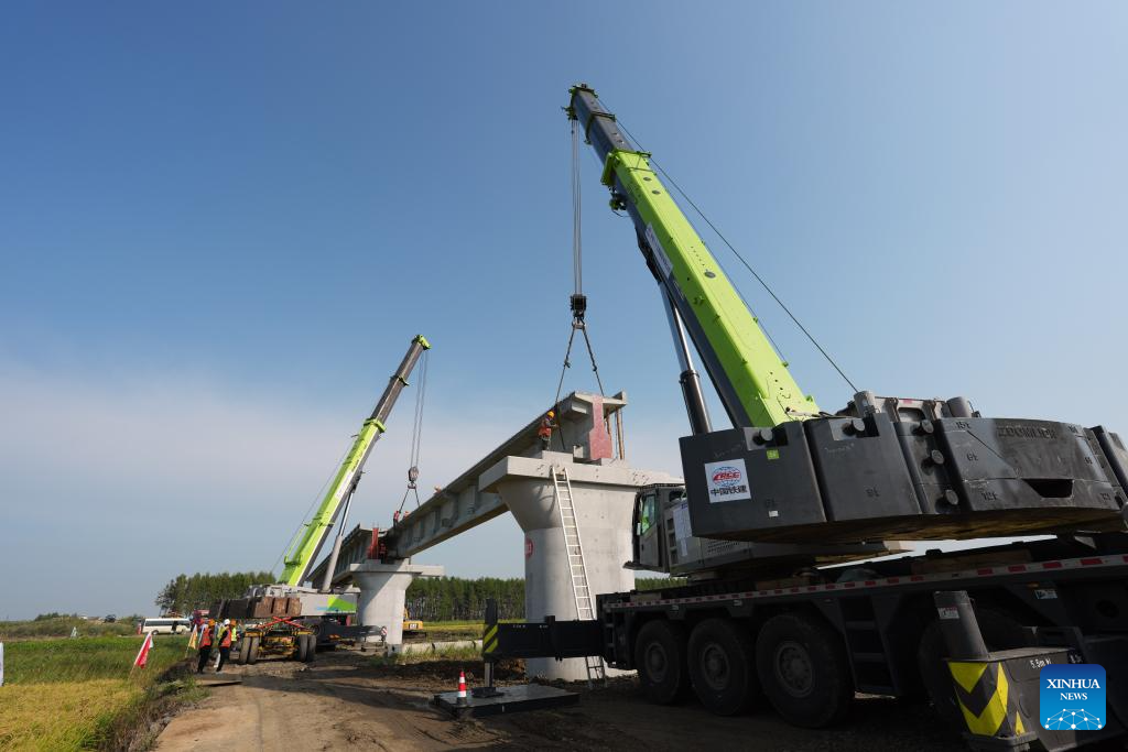 This photo taken on Sept. 5, 2025 shows a construction site of the Tongjiang super major bridge in northeast China's Heilongjiang Province. The Tongjiang super major bridge, part of the capacity expansion and renovation project for the Jiamusi-Tongjiang Railway, started beam erection on Friday.