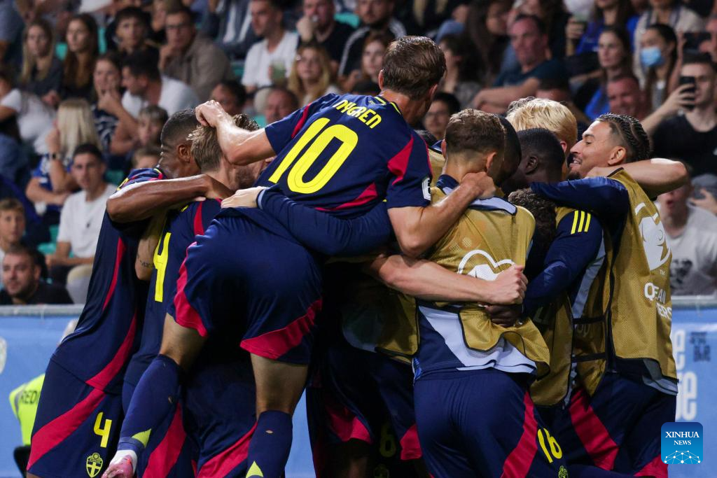 Players of Sweden celebrate scoring during the 2026 FIFA World Cup Qualifiers football match between Slovenia and Sweden in Ljubljana, Slovenia, Sept. 5, 2025. (Photo by Zeljko Stevanic/Xinhua)