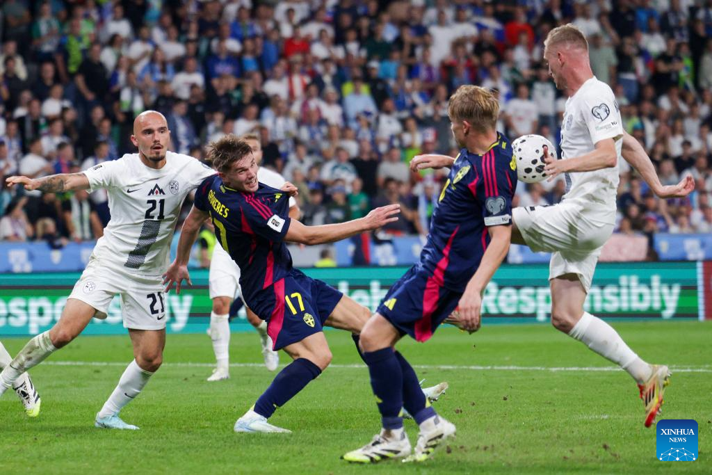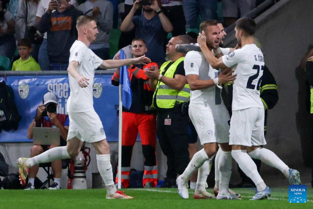 Players of Slovenia celebrate scoring during the 2026 FIFA World Cup Qualifiers football match between Slovenia and Sweden in Ljubljana, Slovenia, Sept. 5, 2025. (Photo by Zeljko Stevanic/Xinhua)