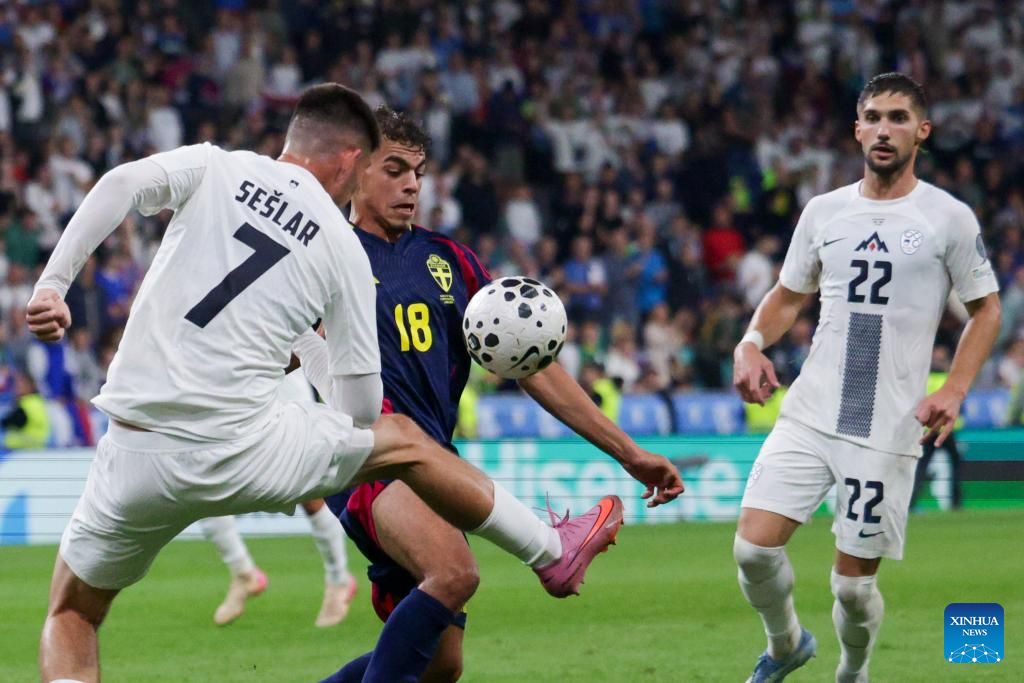Yasin Ayari (C) of Sweden vies with Svit Seslar (L) of Slovenia during the 2026 FIFA World Cup Qualifiers football match between Slovenia and Sweden in Ljubljana, Slovenia, Sept. 5, 2025. (Photo by Zeljko Stevanic/Xinhua)
