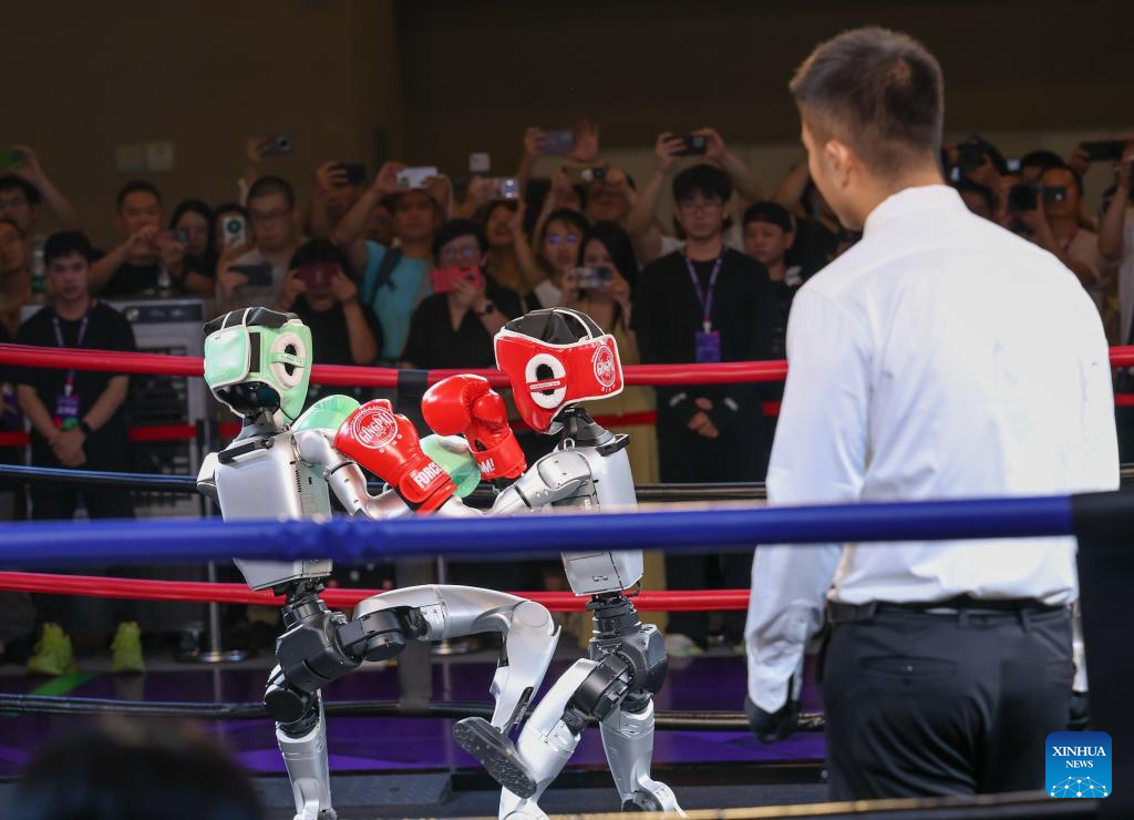 A humanoid robot boxing game is pictured during the World Smart Industry Expo 2025 in southwest China's Chongqing Municipality, Sept. 5, 2025. The World Smart Industry Expo 2025 kicked off on Friday in Chongqing, showcasing various humanoid robots at the event. (Xinhua/Chen Cheng)